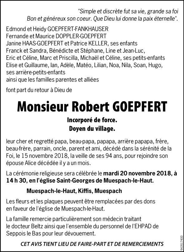 Décédé à Seppois-le-Bas (68580, France) le jeudi 15 novembre 2018 à l'âge de 93 ans