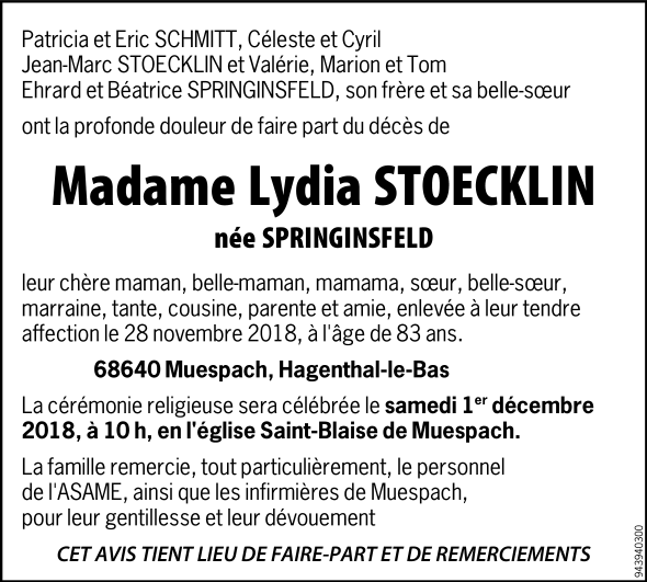 Madame Lydia Marie STOECKLIN née SPRINGINSFELD