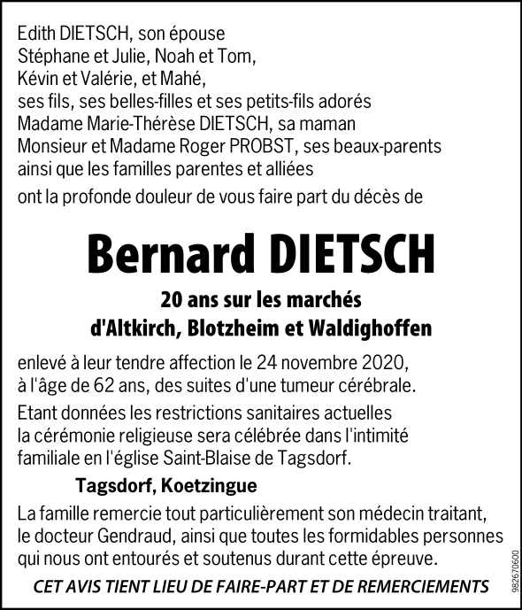 Décédé à Altkirch (68130, France) le mardi 24 novembre 2020 à l'âge de 62 ans