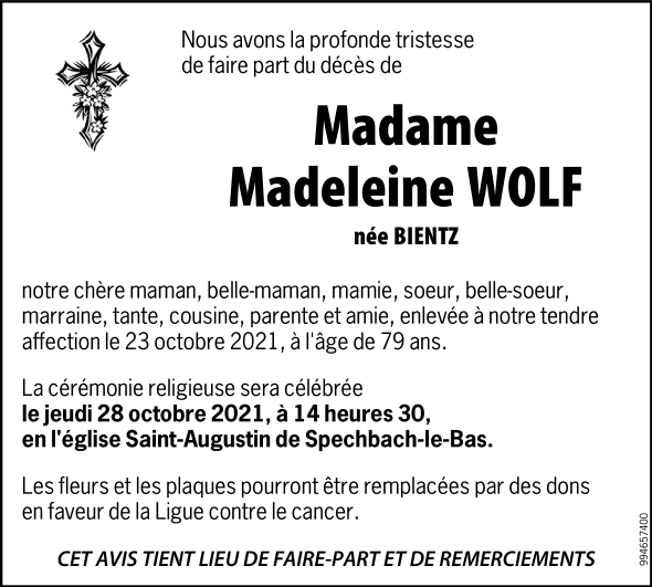 Décédée à Mulhouse (68100, France) le samedi 23 octobre 2021 à l'âge de 79 ans