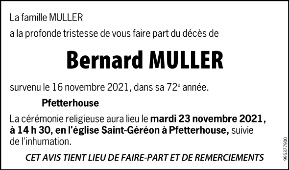 Décédé à Altkirch (68130, France) le mardi 16 novembre 2021 à l'âge de 71 ans