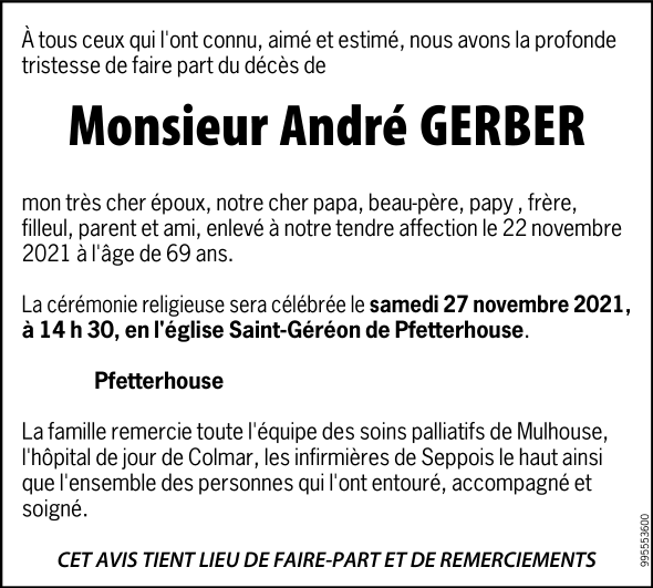 Décédé à Mulhouse (68200, France) le lundi 22 novembre 2021 à l'âge de 69 ans