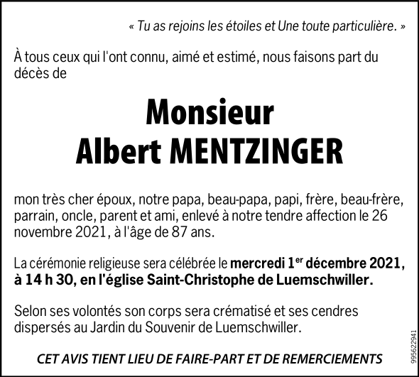 Epoux de Madame Marie-Antoinette MENTZINGER