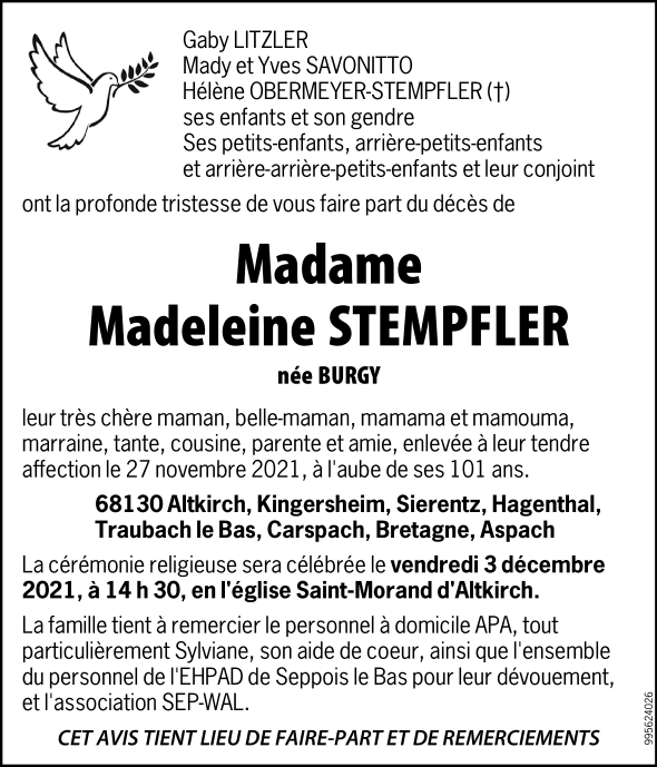 Décédée à Seppois-le-Bas (68580, France) le samedi 27 novembre 2021 à l'âge de 100 ans