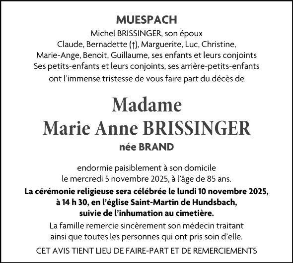 Décédée à Muespach (68640, France) le mercredi 5 novembre 2025 à l'âge de 85 ans