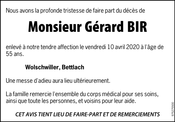 Décédé à Wolschwiller (68480, France) le vendredi 10 avril 2020 à l'âge de 55 ans