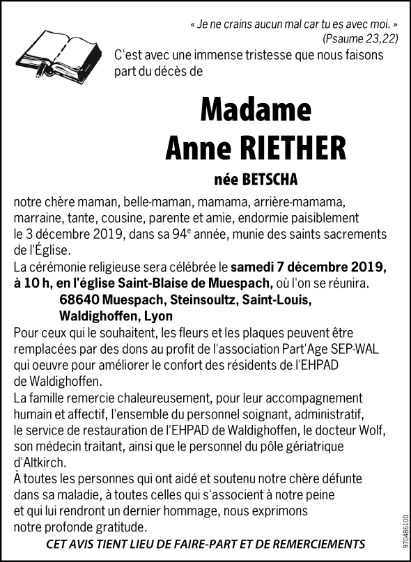 Décédée à Altkirch (68130, France) le mardi 3 décembre 2019 à l'âge de 93 ans