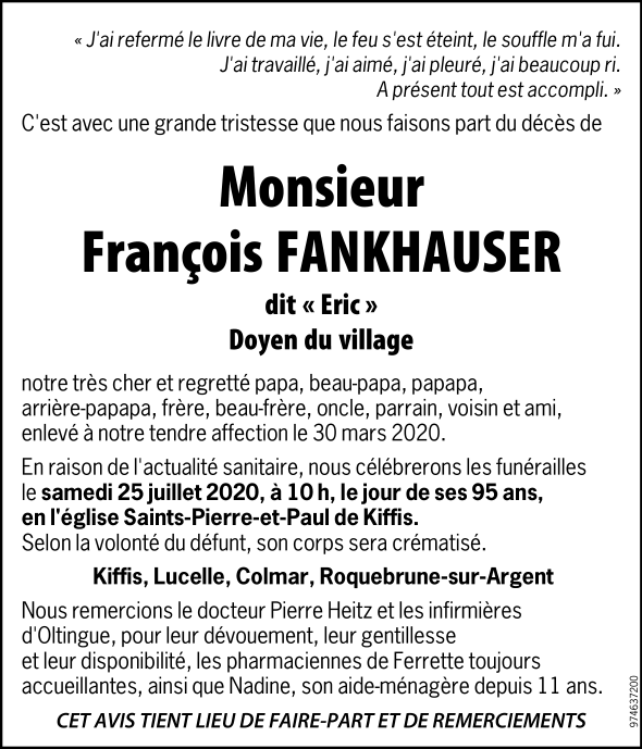 Décédé à Kiffis (68480, France) le lundi 30 mars 2020 à l'âge de 94 ans