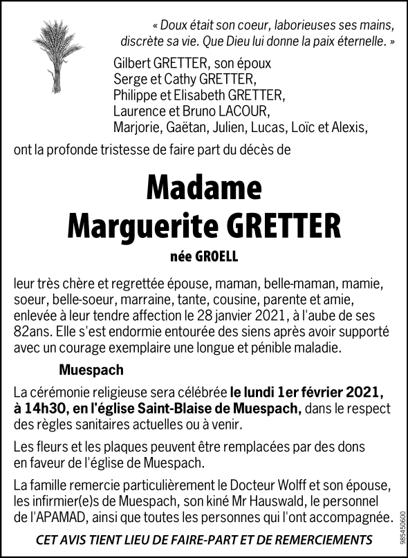 Epouse de Monsieur Gilbert Joseph GRETTER