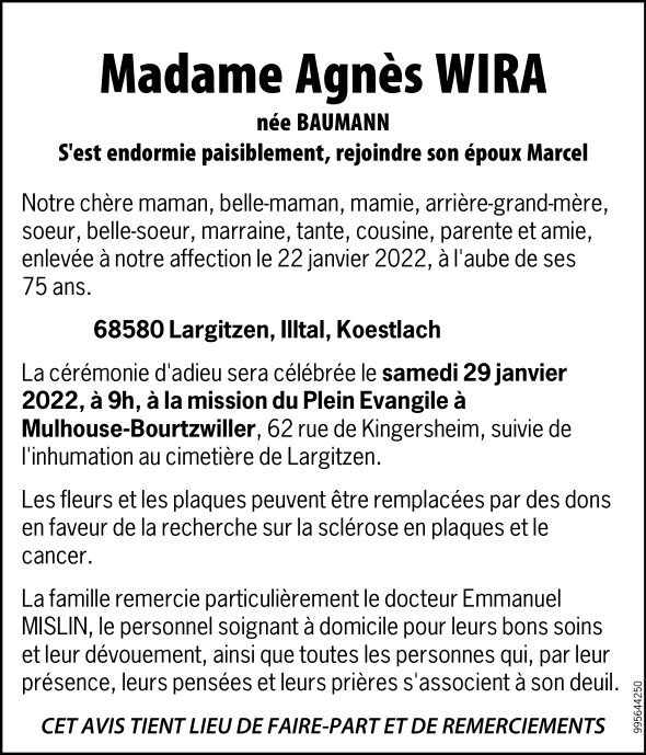 Madame Agnès WIRA née BAUMANN