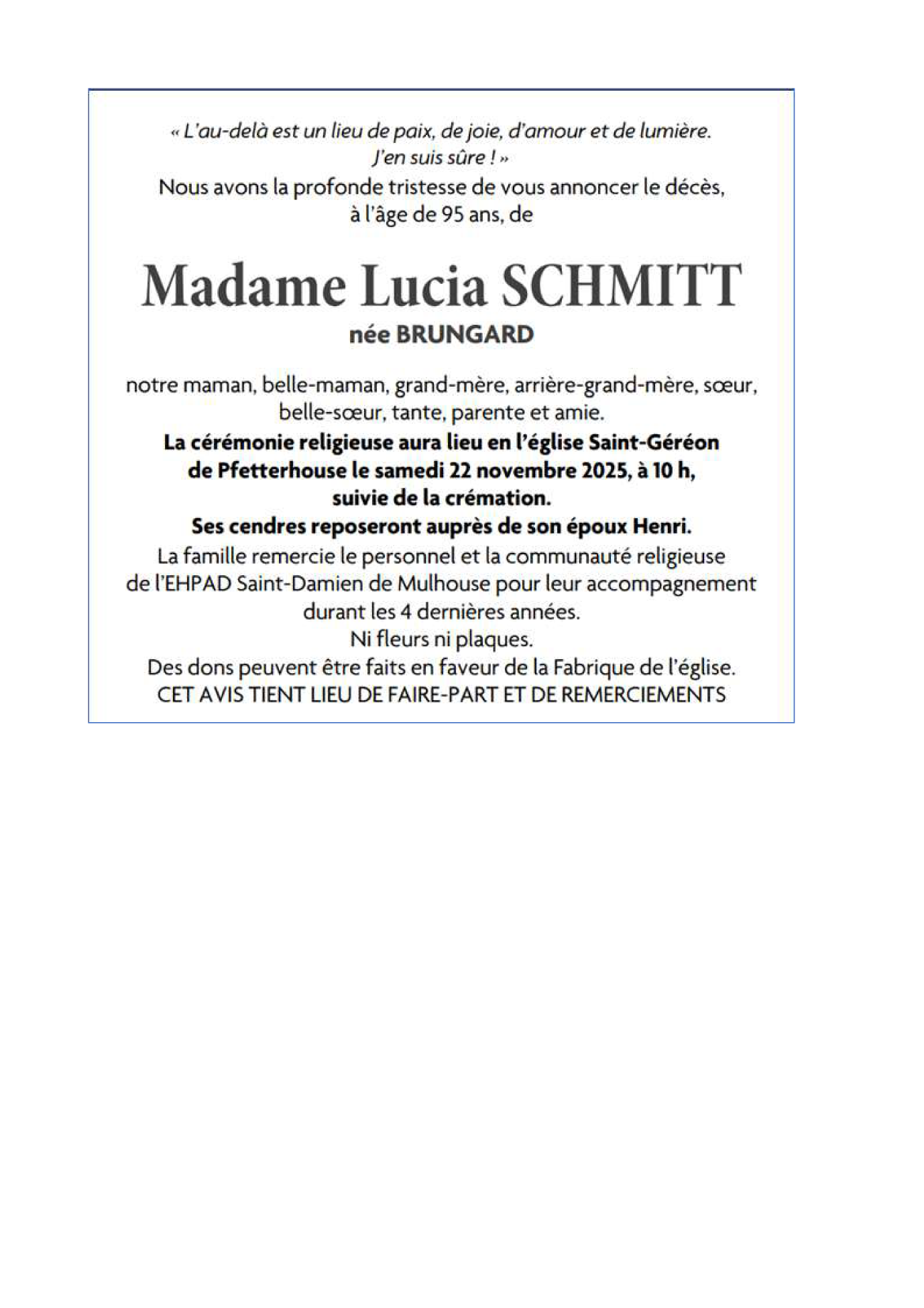 Décédée à Mulhouse (68100, France) le mercredi 19 novembre 2025 à l'âge de 95 ans