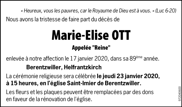 Décédée à Berentzwiller (68130, France) le vendredi 17 janvier 2020 à l'âge de 88 ans