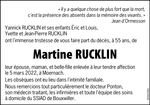 Décédée à Moernach (68480, France) le samedi 5 mars 2022 à l'âge de 55 ans