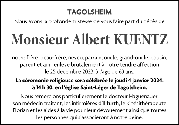 Décédé à Tagolsheim (68720, France) le lundi 25 décembre 2023 à l'âge de 63 ans