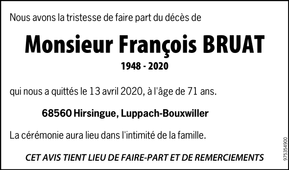 Décédé à Bouxwiller (68480, France) le lundi 13 avril 2020 à l'âge de 71 ans