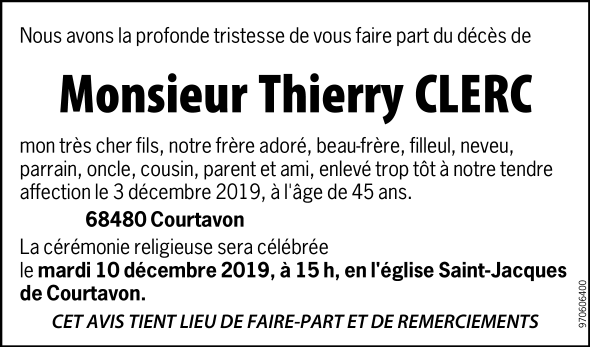 Décédé à Courtavon (68480, France) le mardi 3 décembre 2019 à l'âge de 45 ans