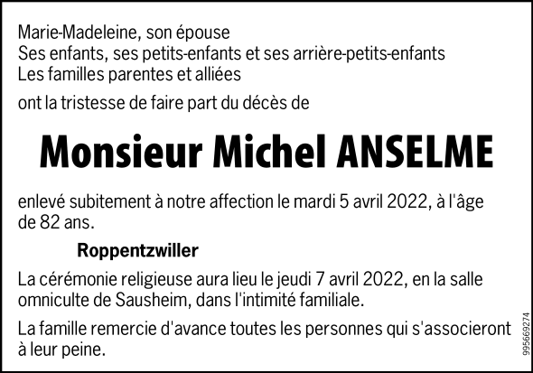 Décédé à Roppentzwiller (68480, France) le mardi 5 avril 2022 à l'âge de 81 ans