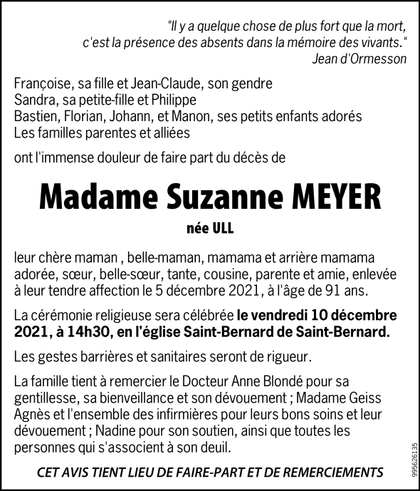 Décédée à Saint-Bernard (68720, France) le dimanche 5 décembre 2021 à l'âge de 91 ans