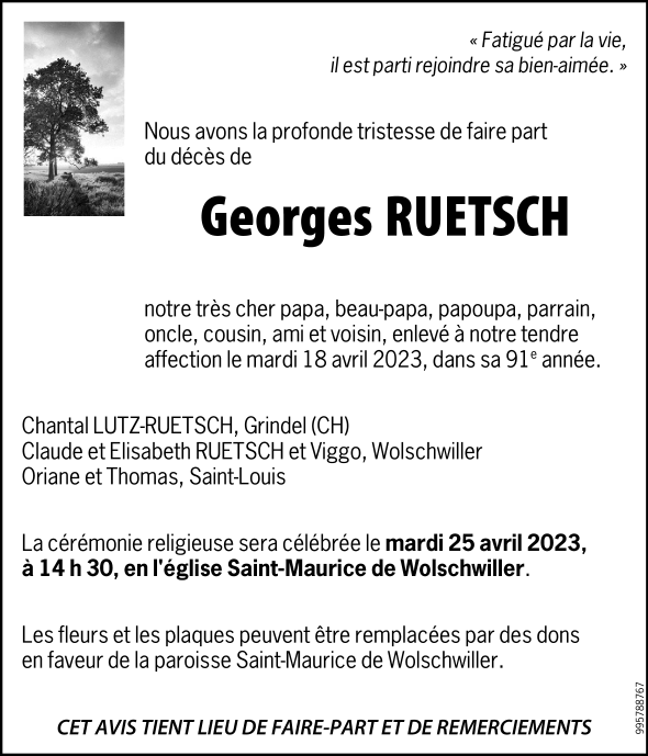 Décédé à Wolschwiller (68480, France) le mardi 18 avril 2023 à l'âge de 90 ans