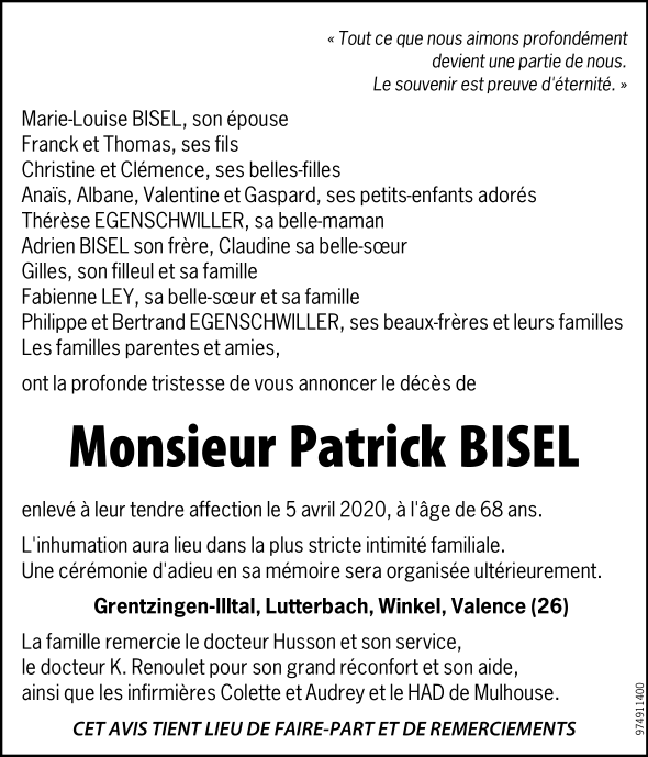 Décédé à Grentzingen (68960, France) le dimanche 5 avril 2020 à l'âge de 68 ans