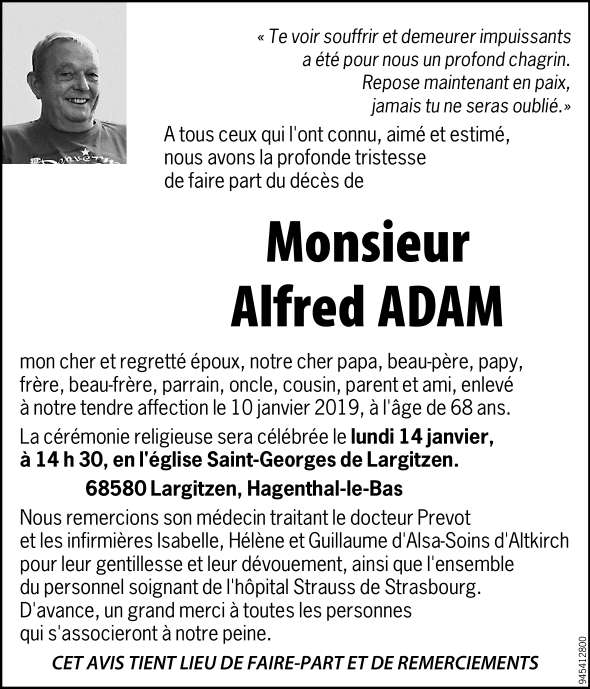 Décédé à Largitzen (68580, France) le jeudi 10 janvier 2019 à l'âge de 68 ans