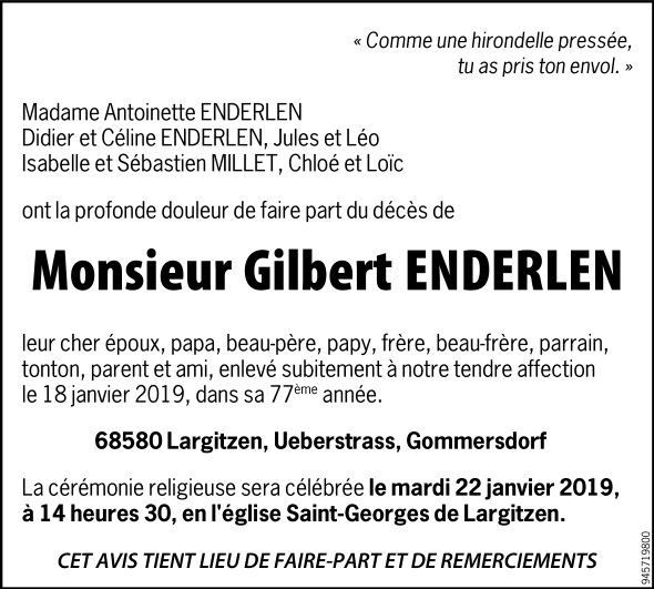 Décédé à Mulhouse (68100, France) le vendredi 18 janvier 2019 à l'âge de 76 ans