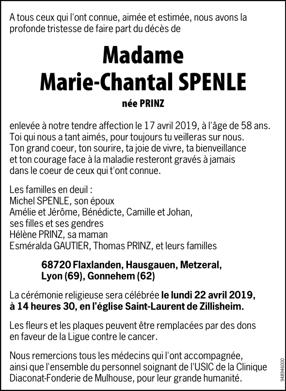 Décédée à Mulhouse (68100, France) le mercredi 17 avril 2019 à l'âge de 58 ans