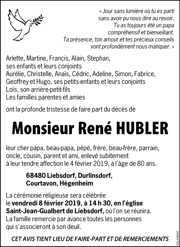 Décédé à Liebsdorf (68480, France) le lundi 4 février 2019 à l'âge de 80 ans