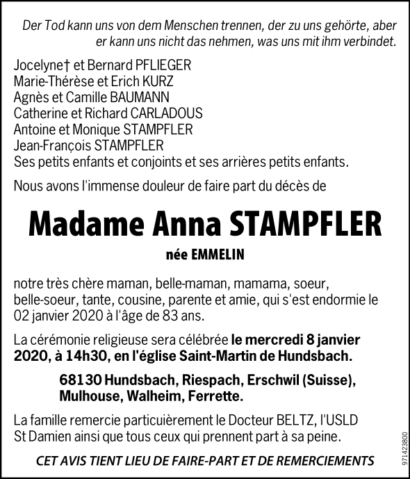 Décédée à Mulhouse (68100, France) le jeudi 2 janvier 2020 à l'âge de 83 ans
