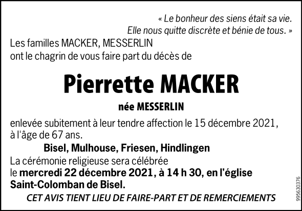 Décédée à Colmar (68000, France) le mercredi 15 décembre 2021 à l'âge de 67 ans