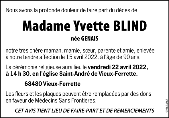 Décédée à Altkirch (68130, France) le vendredi 15 avril 2022 à l'âge de 90 ans