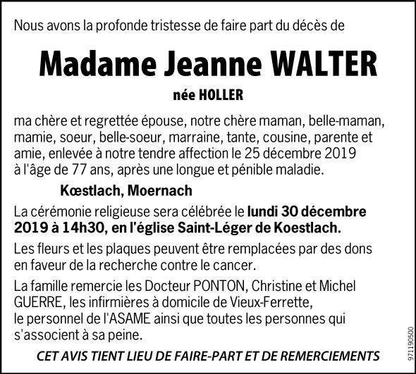 Décédée à Mulhouse (68100, France) le mercredi 25 décembre 2019 à l'âge de 77 ans