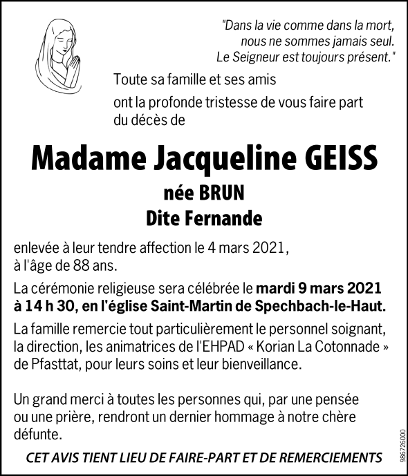 Décédée à Pfastatt (68120, France) le jeudi 4 mars 2021 à l'âge de 88 ans