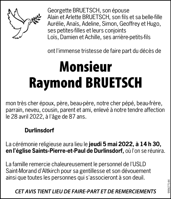 Décédé à Altkirch (68130, France) le jeudi 28 avril 2022 à l'âge de 87 ans