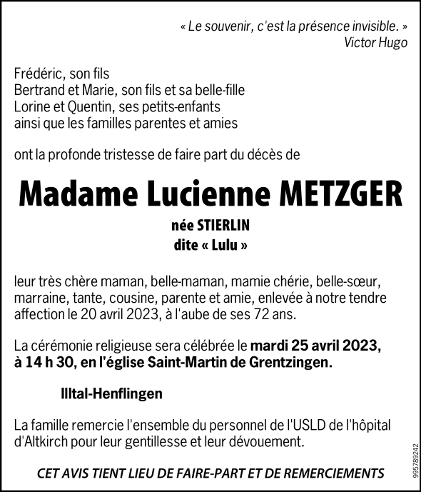 Madame Lucienne Jeannine METZGER née STIERLIN
