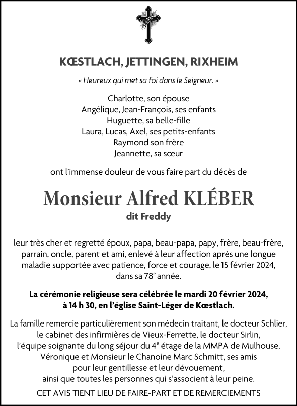 Décédé à Mulhouse (68100, France) le jeudi 15 février 2024 à l'âge de 77 ans