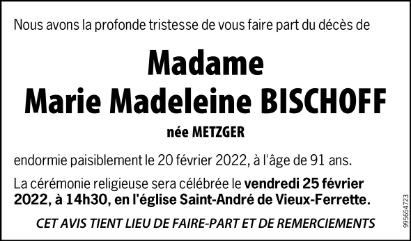 Madame Marie Madeleine BISCHOFF née METZGER