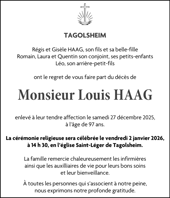 Décédé à Tagolsheim (68720, France) le samedi 27 décembre 2025 à l'âge de 97 ans