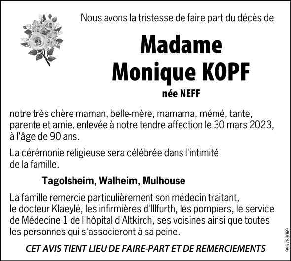 Décédée à Altkirch (68130, France) le jeudi 30 mars 2023 à l'âge de 90 ans