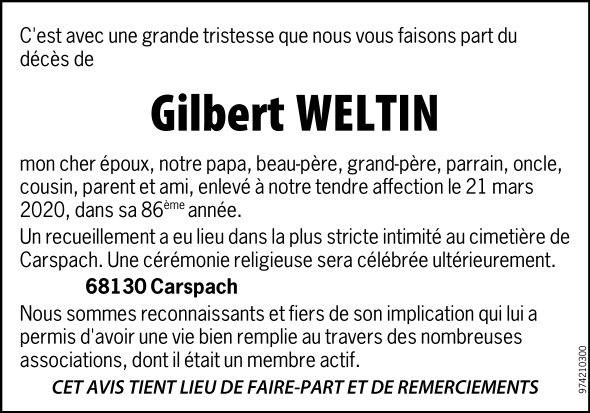 Décédé à Altkirch (68130, France) le samedi 21 mars 2020 à l'âge de 85 ans