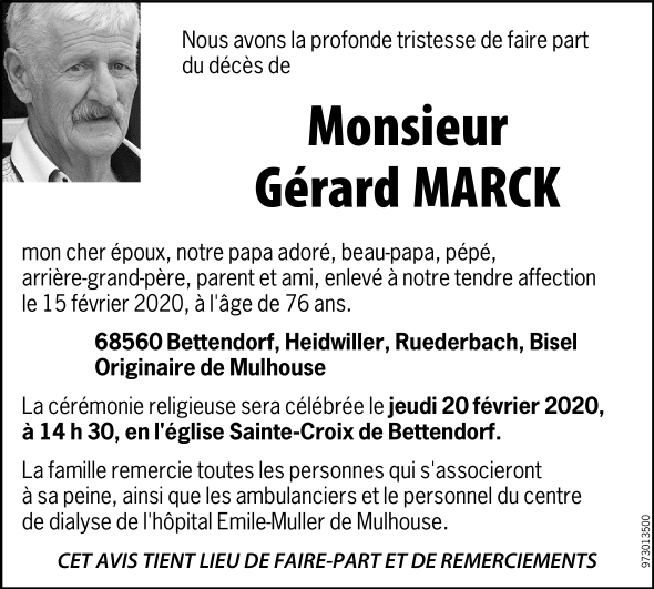 Décédé à Bettendorf (68560, France) le samedi 15 février 2020 à l'âge de 76 ans