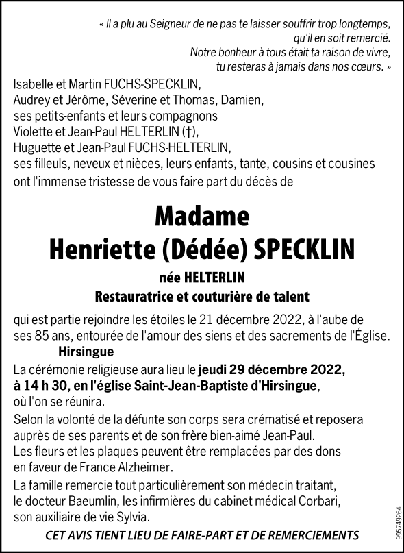 Veuve de Madame Marcel SPECKLIN