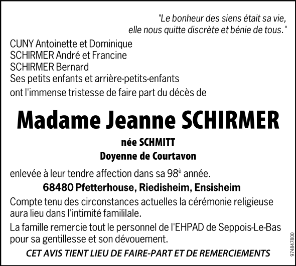 Décédée à Seppois-le-Bas (68580, France) le vendredi 3 avril 2020 à l'âge de 97 ans