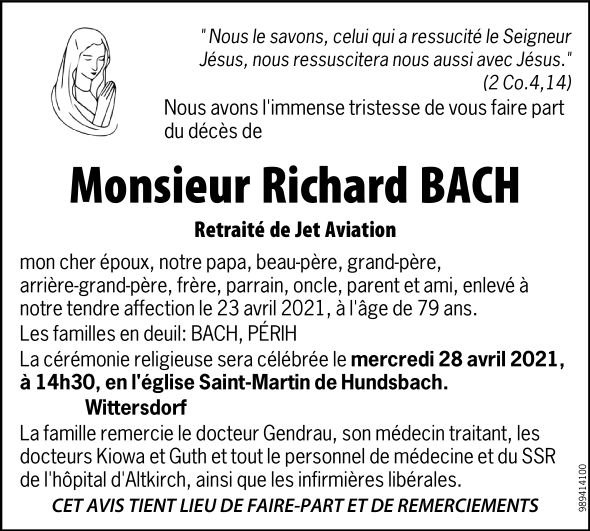 Décédé à Altkirch (68130, France) le vendredi 23 avril 2021 à l'âge de 79 ans