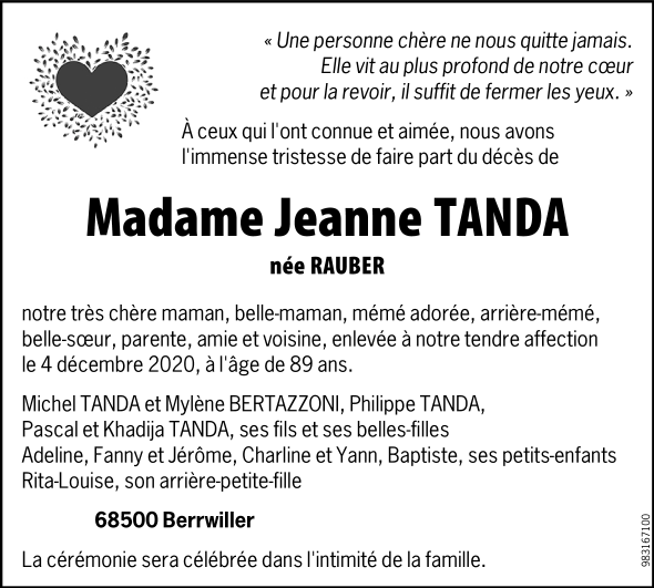 Décédée à Homécourt (54310, France) le vendredi 4 décembre 2020 à l'âge de 89 ans
