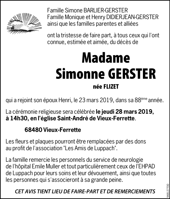 Décédée à Mulhouse (68100, France) le samedi 23 mars 2019 à l'âge de 87 ans