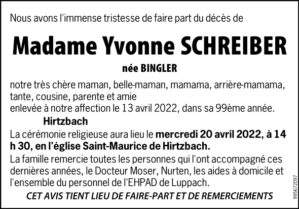 Madame Yvonne SCHREIBER née BINGLER