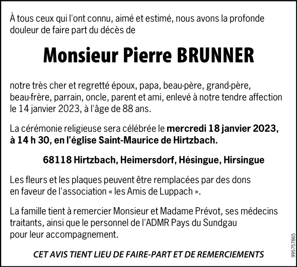 Décédé à Hirtzbach (68118, France) le samedi 14 janvier 2023 à l'âge de 88 ans