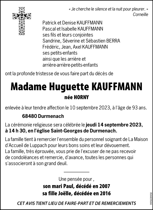 Madame Huguette Renée Marcelle KAUFFMANN née HORNY