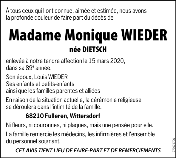 Madame Monique Julie WIEDER née DIETSCH